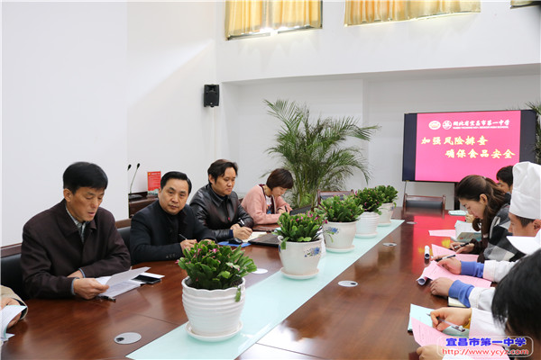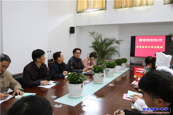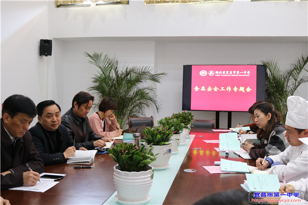 3月18日上午10点,宜昌市第一中学总务处在墨池书院三楼召开食品安全工作专题会,会议由总务处赵伟主任主持,刘克诚副校长、何金元副主任、食堂等服务体负责人参会。