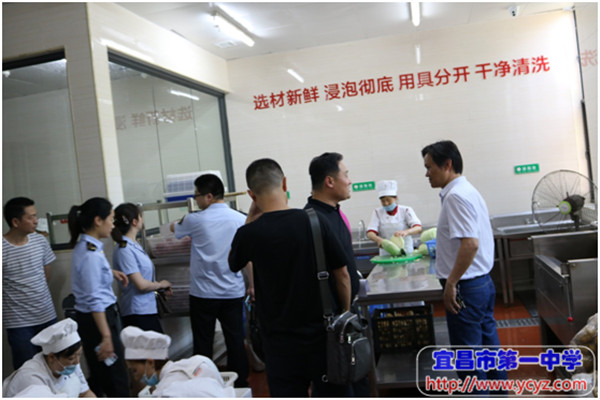 6月3日下午,宜昌市学校后勤管理办公室副主任王恩海、综合业务二部主任黄海,点军区市场监督管理局高宇同志一行来我校食堂检查高考食品安全、寝室及交通保障工作,学校副校长刘克诚、总务处主任赵伟陪同检查组一行深入食堂各个功能区进行了细致查看,刘克诚介绍了一中在保障师生食品安全工作中采取的各项具体措施,检查组充分肯定了宜昌一中在食品安全工作中取得的成绩,要求学校上下一定要继续加强学校食堂关键环节的控制和监管,严格落实《学校食品安全与营养健康管理规定》,确保高考期间考生吃得好、睡得香、出行便捷。