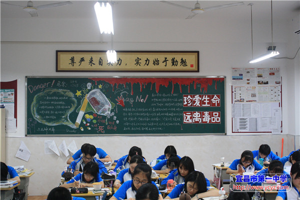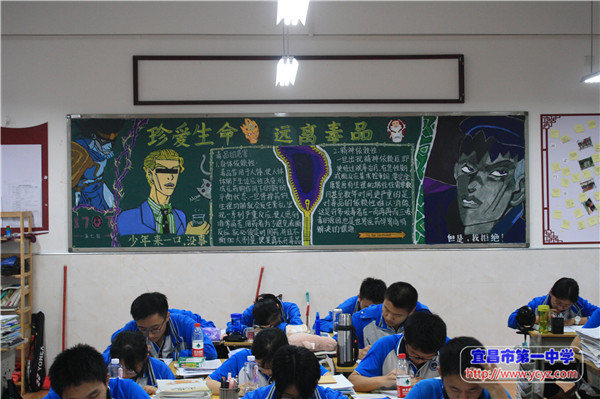 高一年级以“节能减排,低碳生活”为主题。黑板报配图精美,有设计感。1801班用宣传画的形式呼吁节水,富有号召力,引人深思。高二年级则以“拒绝毒品,健康生活”为主题。1705班为突出毒品的危害,用鲜艳的红色表现生命的凋零,十分具有有冲击力。