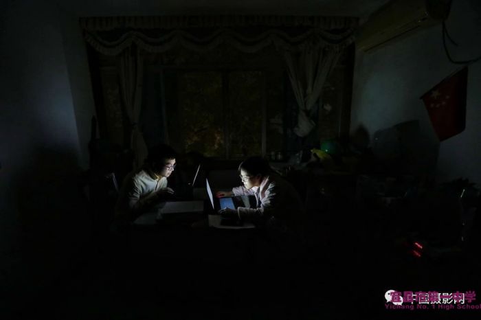 ▲4月24日晚20:05,高三年级副主任吴远林(左)在家云监考“语文四月调考”,同为高中老师的爱人向佳莉(右)在网上检查学生作业。