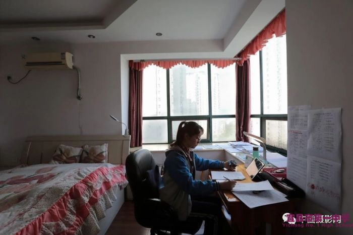 ▲1716班林睿琪,爸爸、妈妈都是医务人员。为了不让父母为自己分心,她对自己的要求更加严格,每天起床后照旧穿上校服。她在父母的卧室支起课桌,墙上贴着本月各科复习的计划安排。在自律中保持健康快乐,在自律中收获学习乐趣。