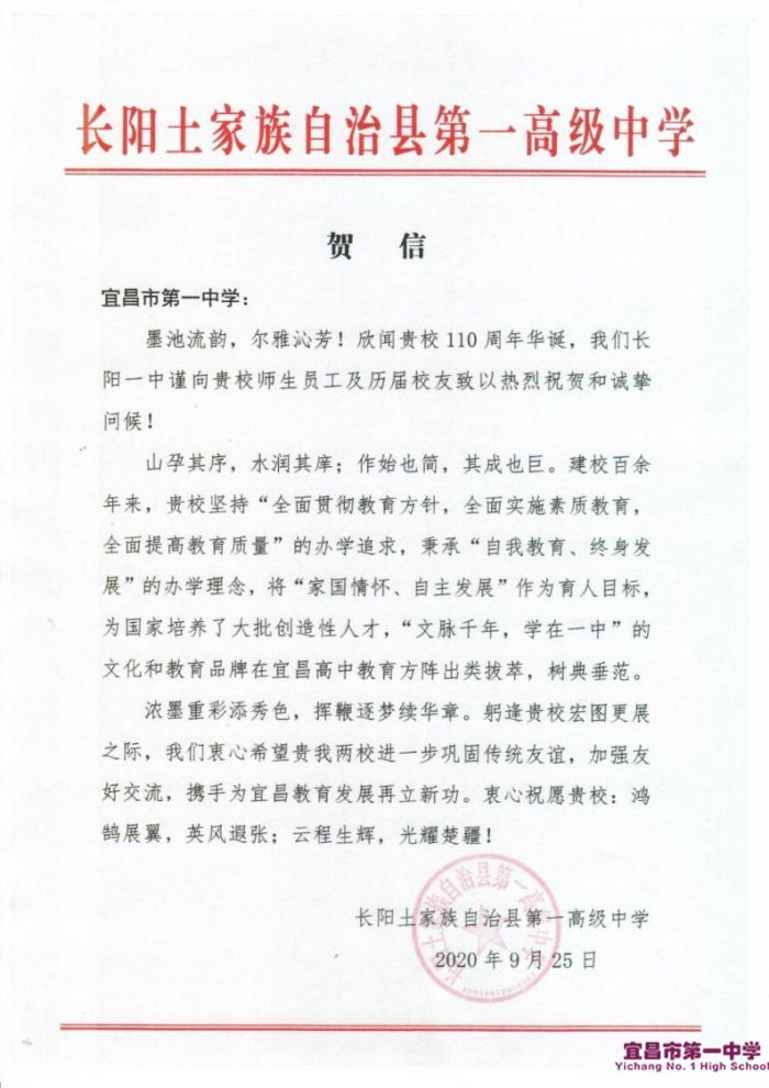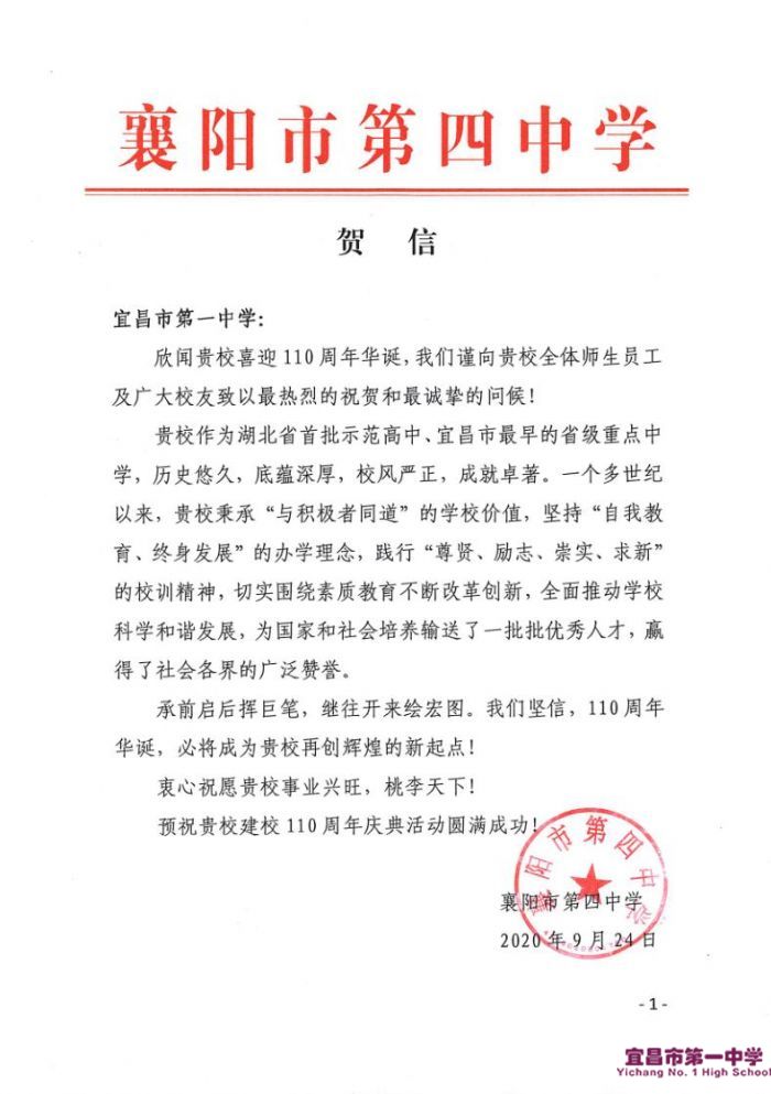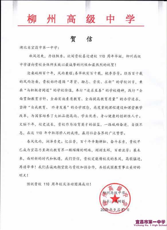 【校庆贺信】柳州市高级中学、襄阳第四中学、长阳土家族自治县第一高级中学 2020-09-30 14:40:01 柳州高级中学向我校发来贺信襄阳市第四中学向我校发来贺信长阳土家族自治县第一高级中学向我校发来贺信