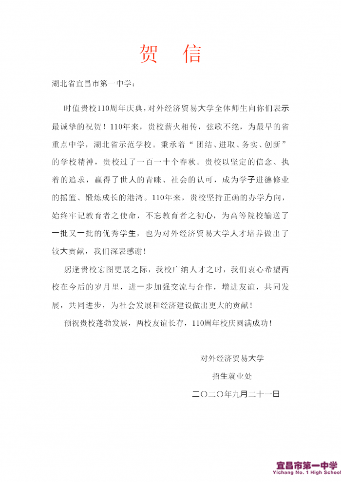 对外经济贸易大学向我校发来贺信