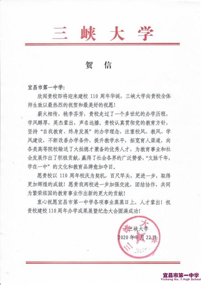 三峡大学向我校发来贺信