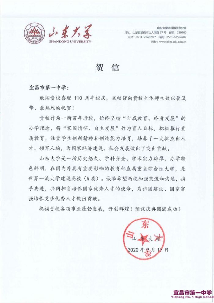 山东大学向我校发来贺信