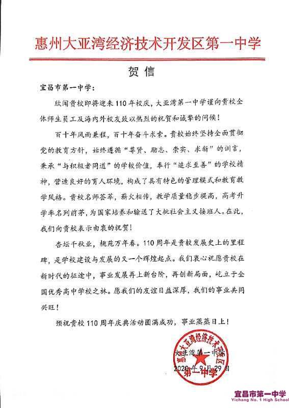 【校庆贺信】安徽省宁国中学、安阳市第三中学、惠州大亚湾经济技术开发区第一中学