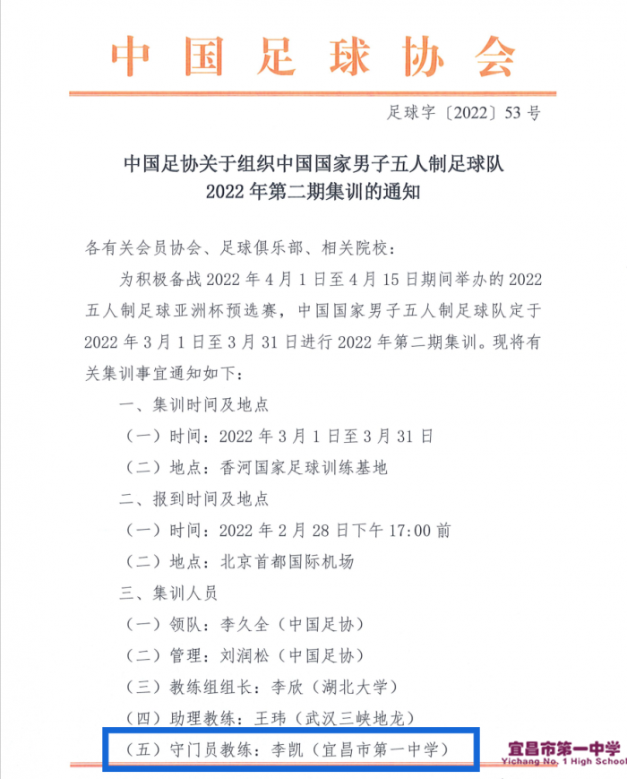 近日,中国足球协会正式发布《中国足协关于组织国家男子五人制足球队2022年第二期集训的通知》,我校体育教师李凯入选中国国家男子五人制足球队守门员教练集训名单,并将于2月28日前往国家足球训练基地参加中国足协组织的国家队集训。