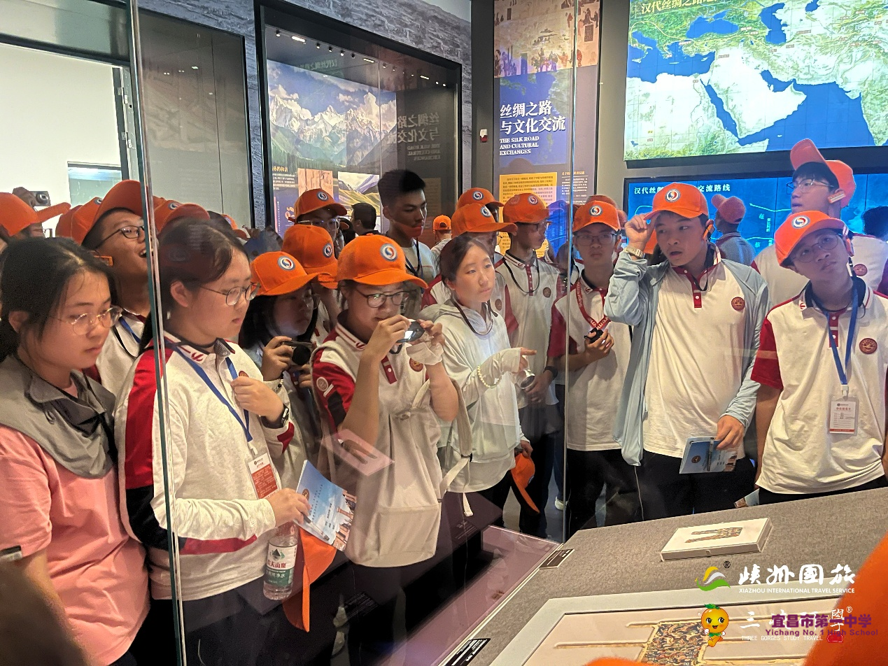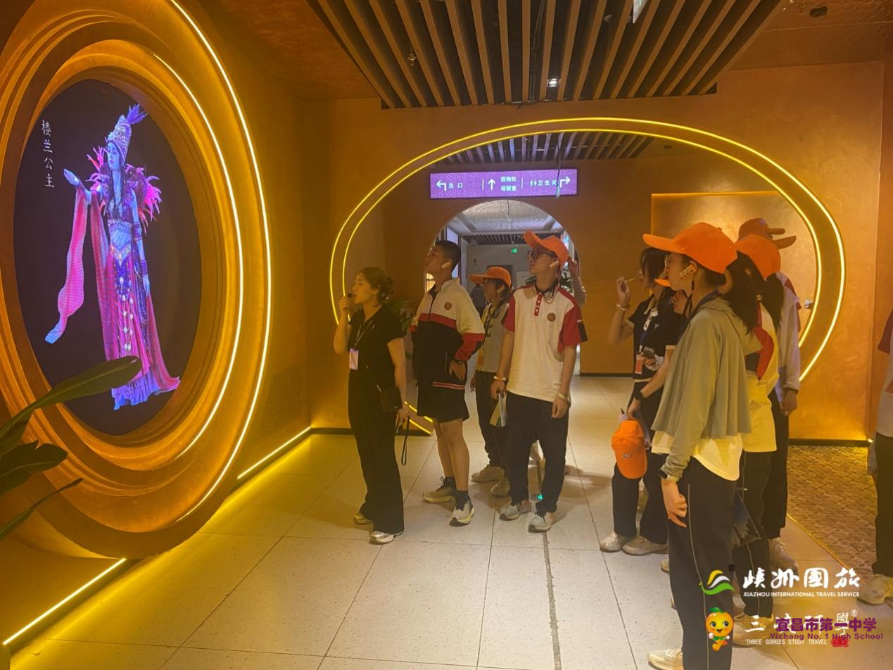 5月14日上午,师生走进八路军驻新疆办事处纪念馆。透过陈潭秋、毛泽民等烈士的遗物与书信,回顾抗战时期中国共产党在新疆的奋斗历程。“这里每一页档案都是红色基因的鲜活载体。” 让学生在参观过程中重温来时之路,不忘身上重任。中午短暂探访国际大巴扎,学生们穿梭于民族手工艺品店铺,观察馕坑烘焙、乐器制作等场景,在30分钟的“微调研”中记录现代丝路的商贸活力。 下午来到大型剧场《丝路有戏》,观看古今丝路故事穿越时空对话。在李白的将近酒中,在胡姬酒肆的各种故事中,在演员与观众的精彩互动中,学生们纷纷惊叹敦煌壁画的瑰美和演艺的精湛。
