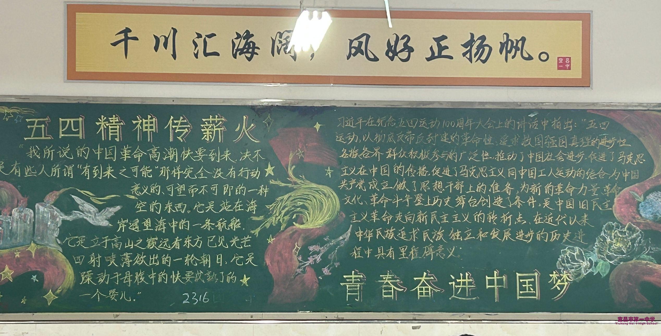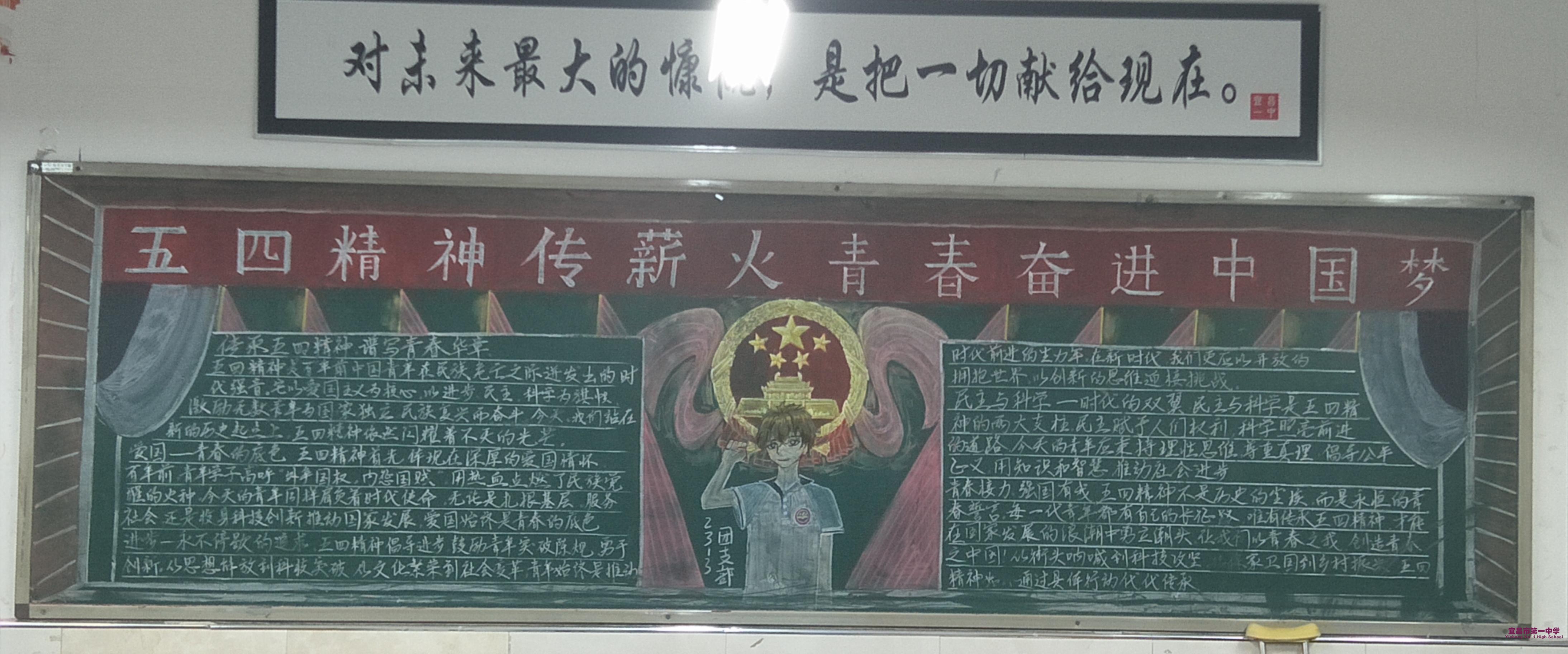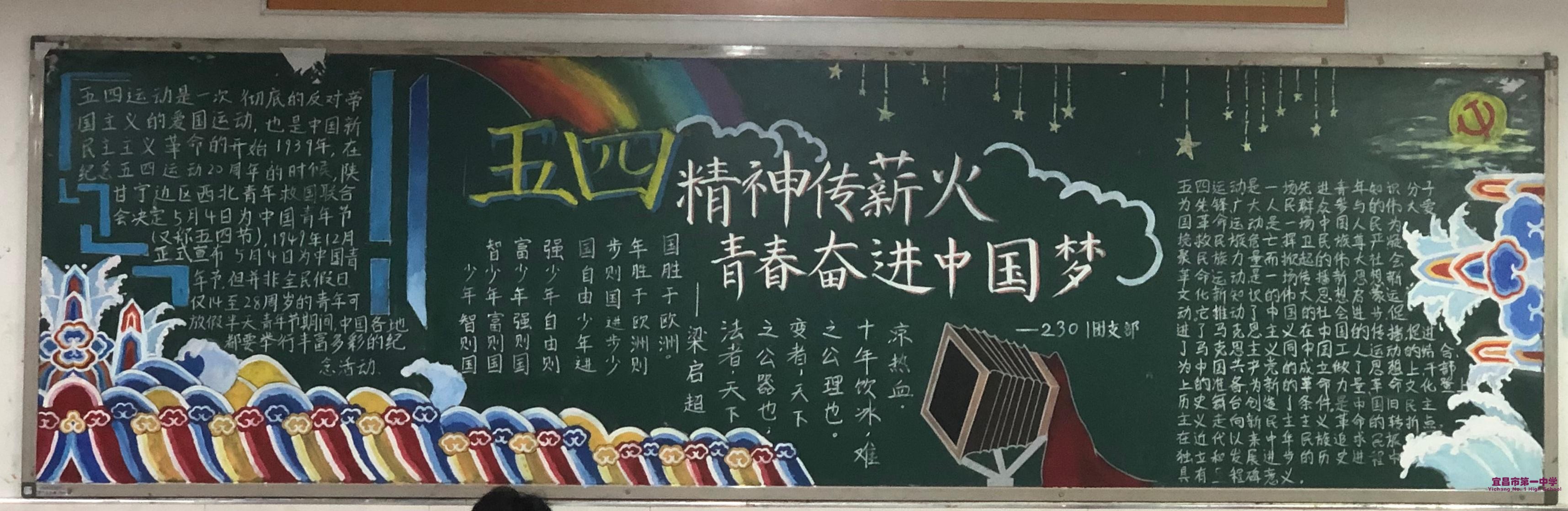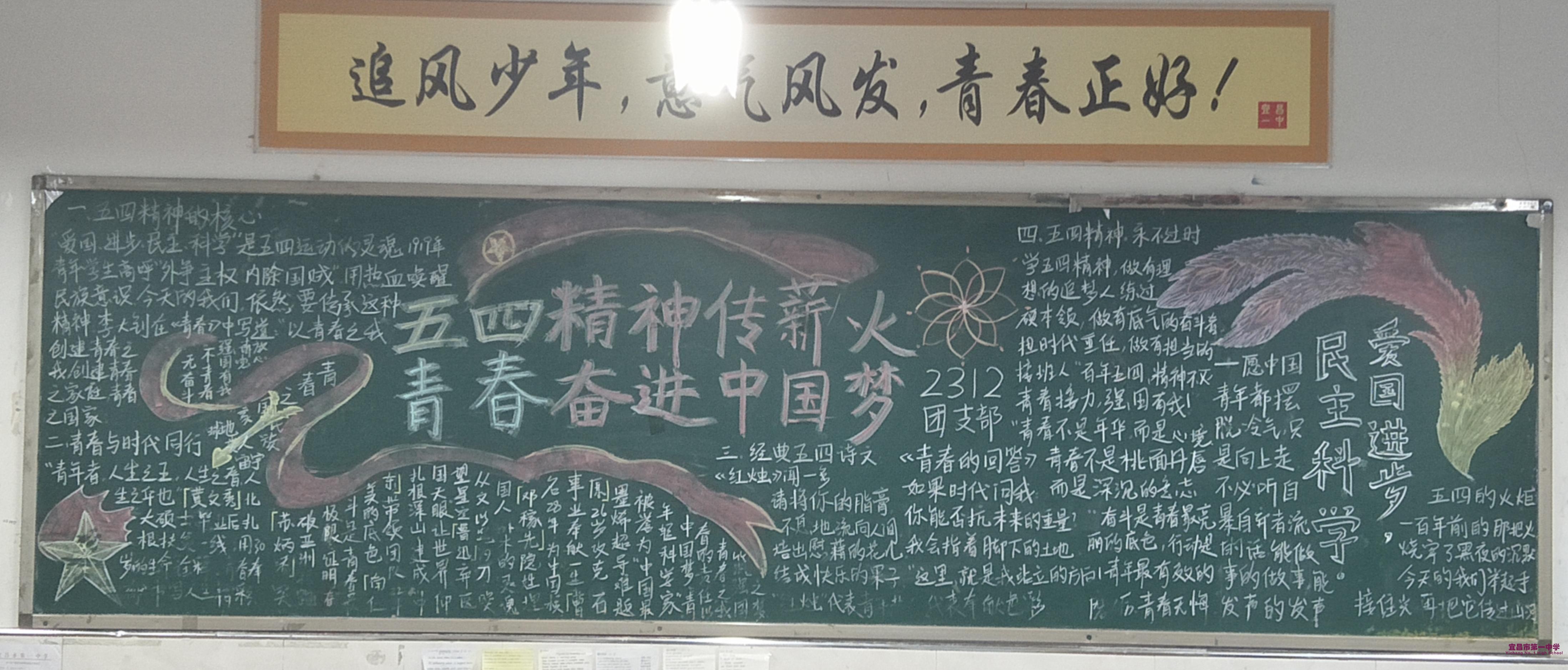 为弘扬五四精神,激发青年学子的爱国情怀与奋斗热情,我校近日组织开展了以“五四精神传薪火 青春奋进中国梦”为主题的黑板报创作活动。本次活动旨在引导同学们铭记历史、传承五四精神,以青春之我、奋斗之我,勇担时代使命,为实现中华民族伟大复兴的中国梦贡献青春力量。