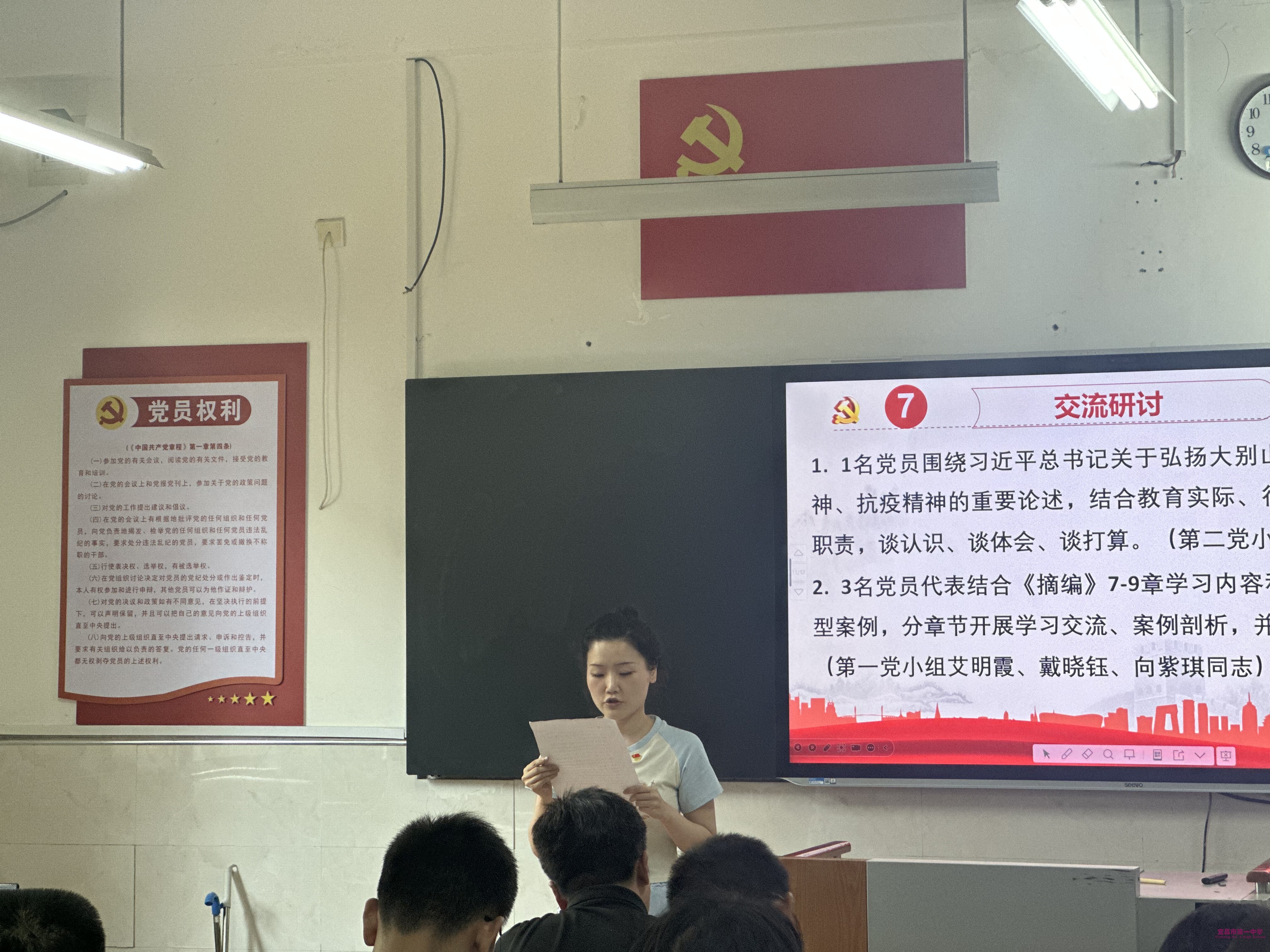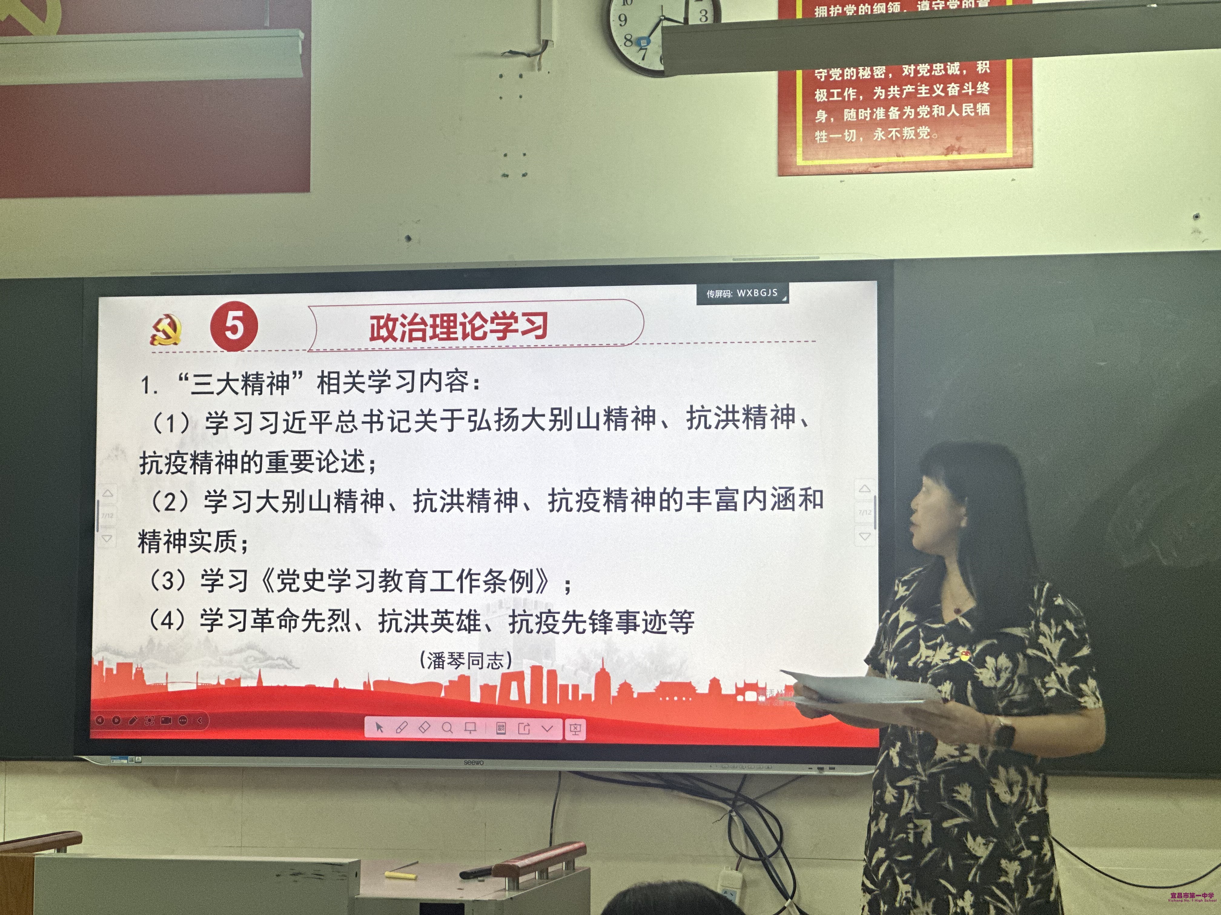 支部党日现场,支部书记潘琴同志带领学习习近平总书记关于弘扬大别山精神、抗洪精神、抗疫精神的重要论述,学习大别山精神、抗洪精神、抗疫精神的丰富内涵和精神实质,学习《党史学习教育工作条例》,学习革命先烈、抗洪英雄、抗疫先锋事迹等,学习关于印发《党的十八大以来宜昌市贯彻落实中央八项规定精神情况的总结》的通知。
