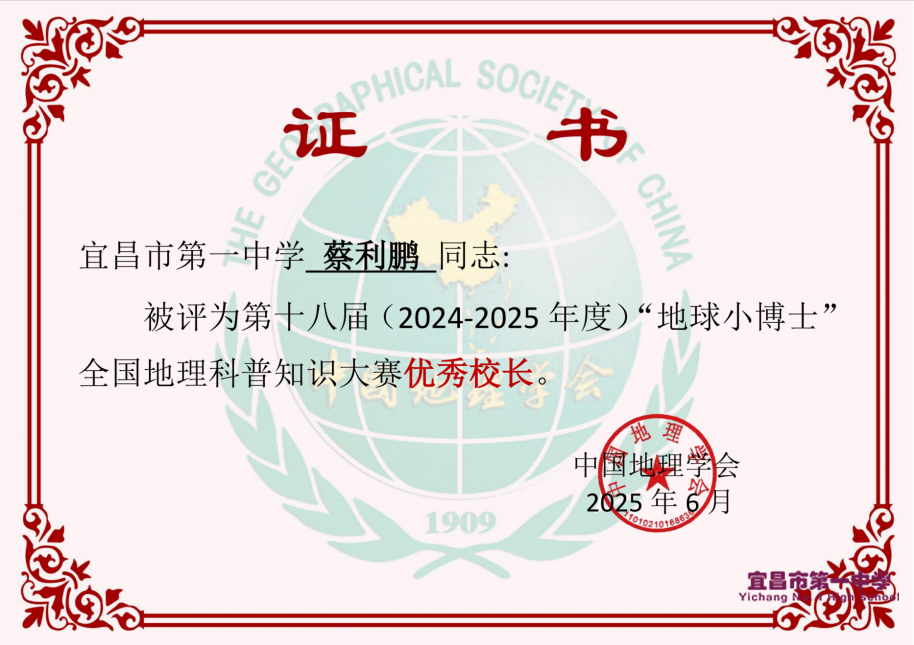 近日,在第十八届全国地球小博士地理科普知识竞赛中,夏梓芸、范怡君两位同学表现优秀,斩获全国一等奖,刘宇宸等18位同学荣获全国二等奖,胡梁源等177位同学荣获全国三等奖,总计获奖人数大197人!同时宜昌一中被授予“优秀组织奖”称号,蔡利鹏校长被授予“优秀校长”荣誉称号!这多重殊荣彰显了我校在地理科学教育、环保理念培养和实践创新方面的卓越成效。
