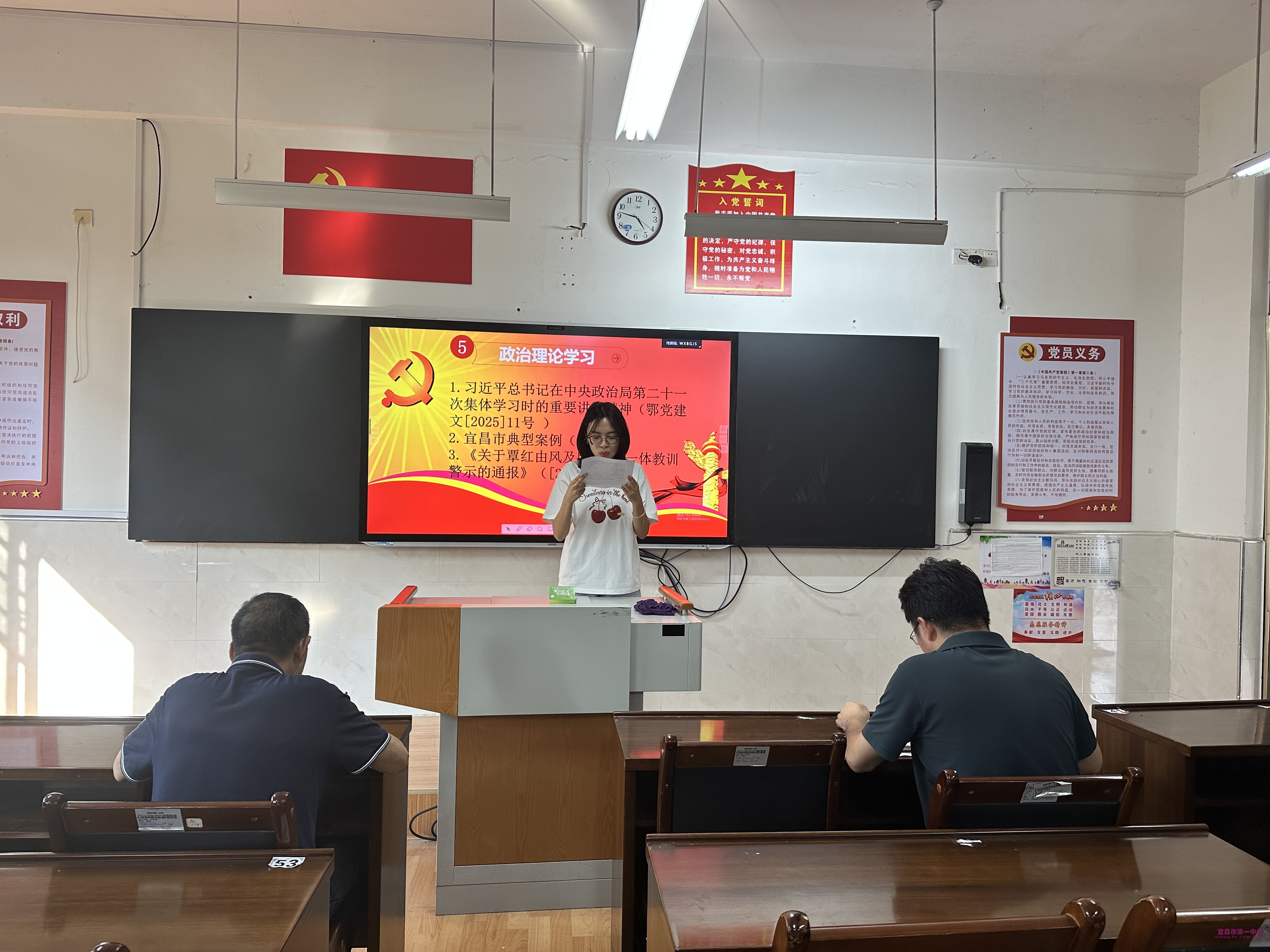 会前,所有党员已经自学“宜昌市典型案例”相关内容。会上,交纳党费后,吴远林带领全体党员重温入党誓词,并学习党章第二十七条。随后,全体党员集体为7、8月入党党员过政治生日。