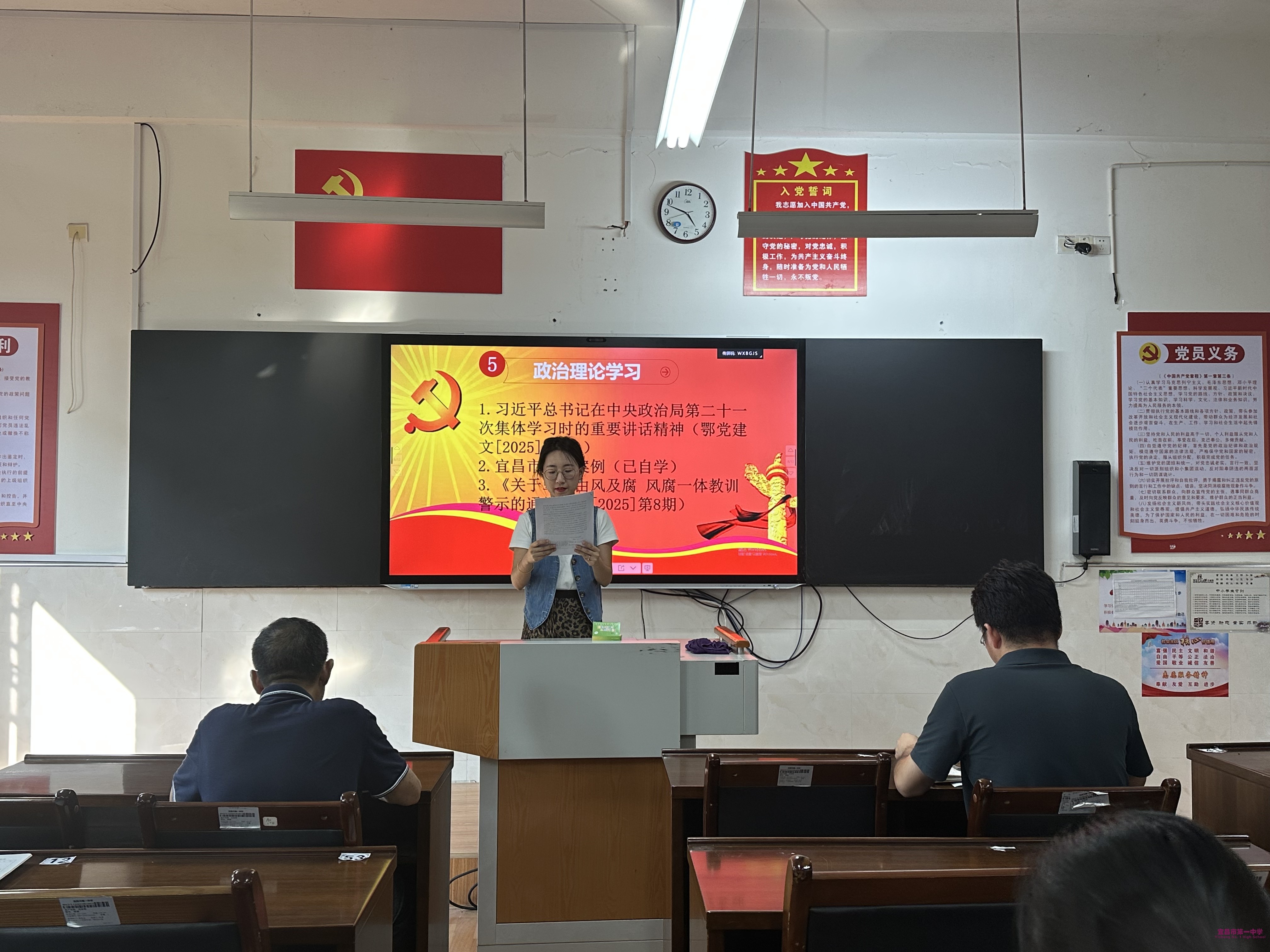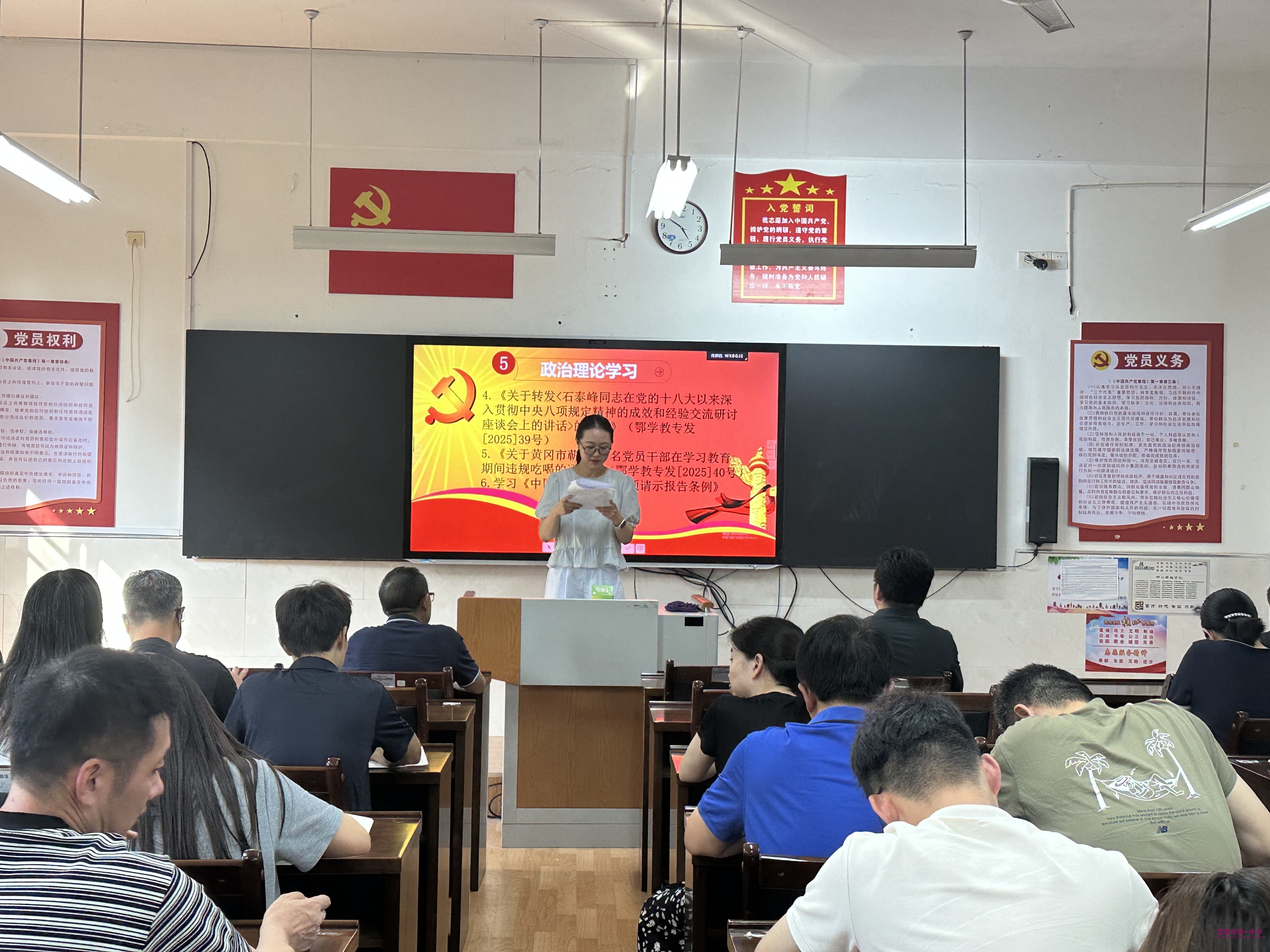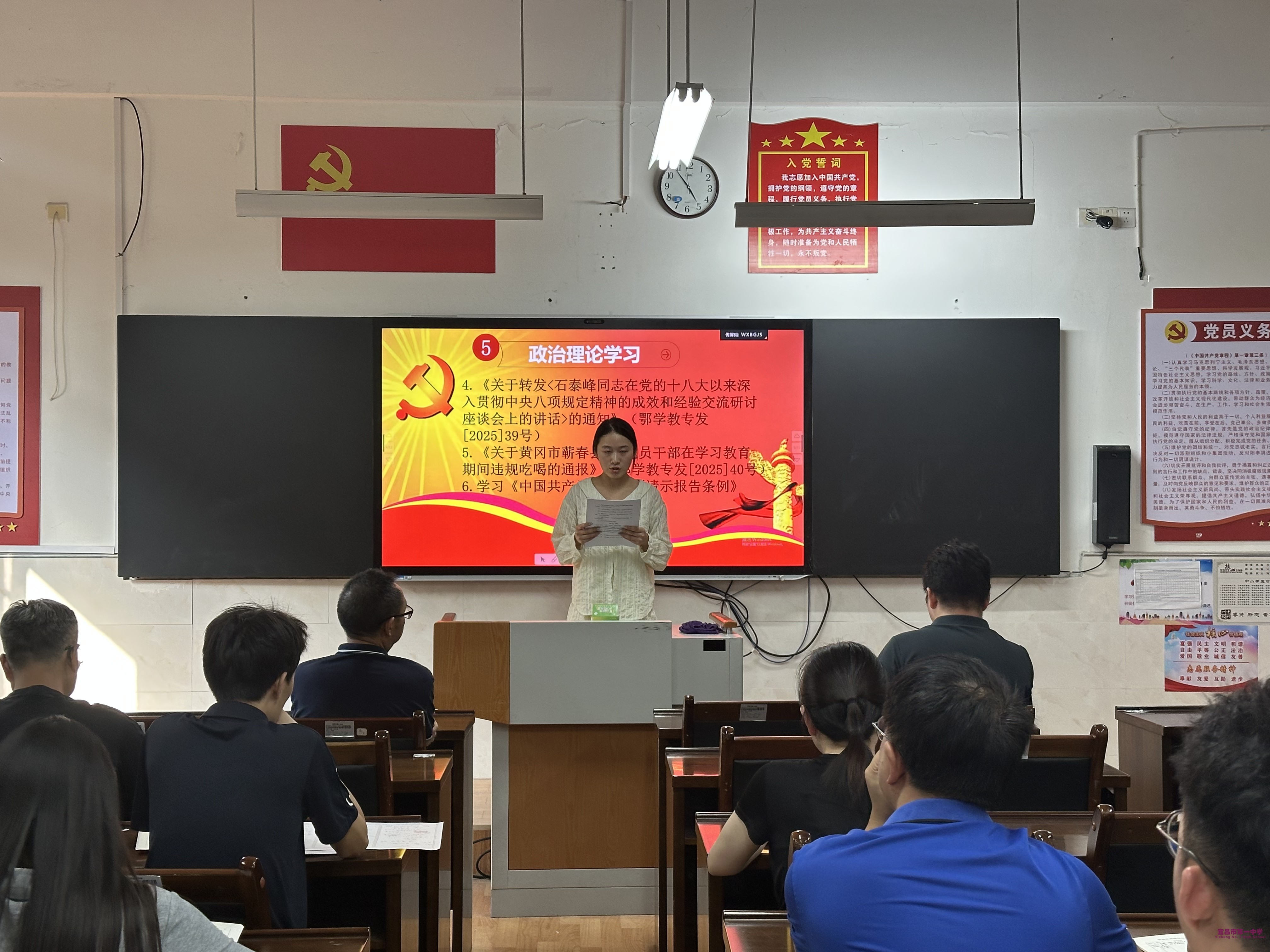 政治理论学习中,周珊同志领学“习近平总书记在中央政治局第二十一次集体学习时的重要讲话精神”;彭盈同志结合《关于覃红由风及腐 风腐一体教训警示通报》,以案释纪揭示“风腐一体”演变规律;邢诗怡同志宣讲《关于转发〈石泰峰同志在党的十八大以来深入贯彻中央八项规定精神的成效和经验交流研讨座谈会上的讲话〉的通知》,强调作风建设永远在路上;张雪同志剖析蕲春县违规吃喝案例,敲响纪律警钟;吉雅洁同志解读《重大事项请示报告条例》,要求党员筑牢政治规矩意识。