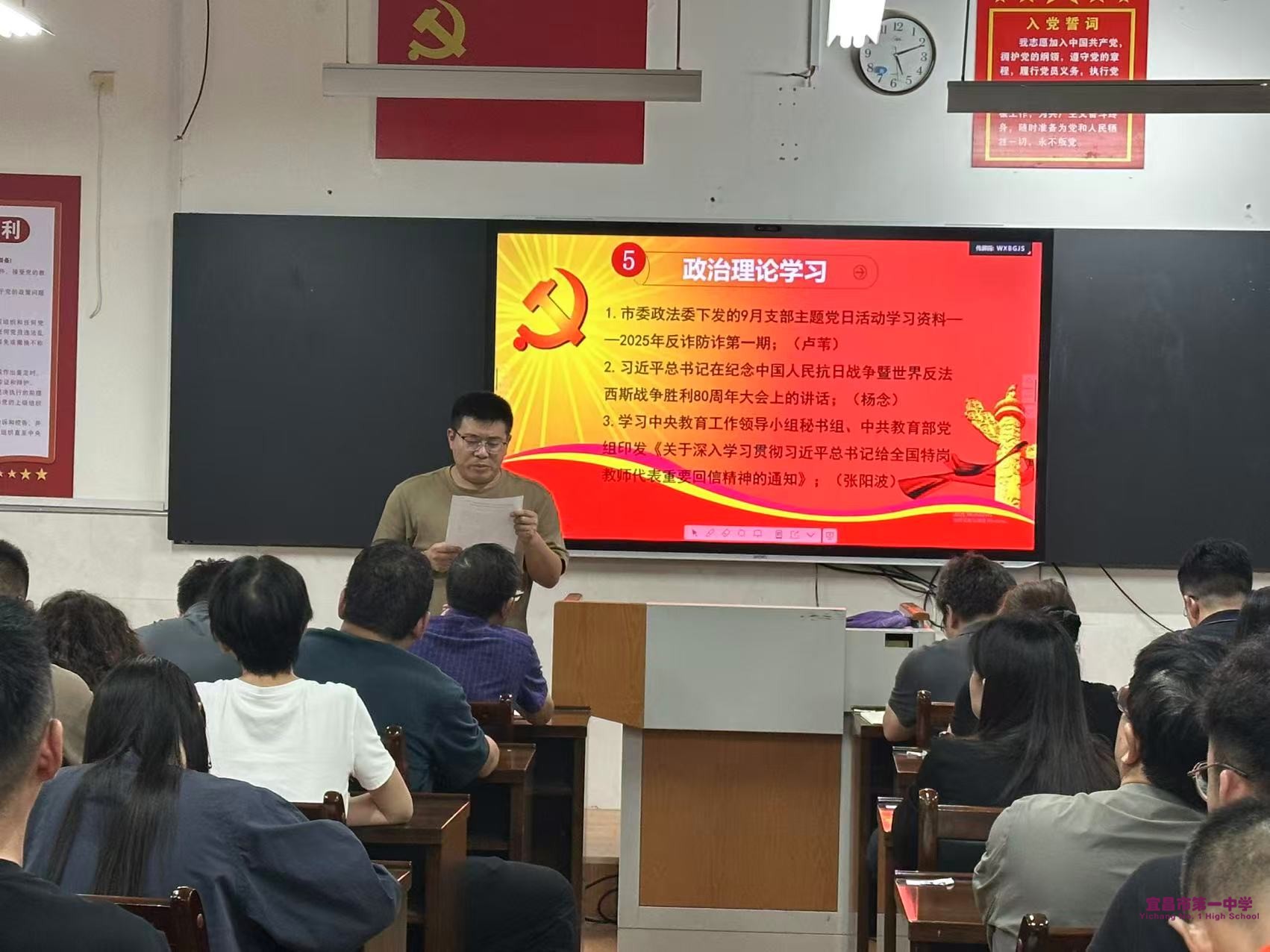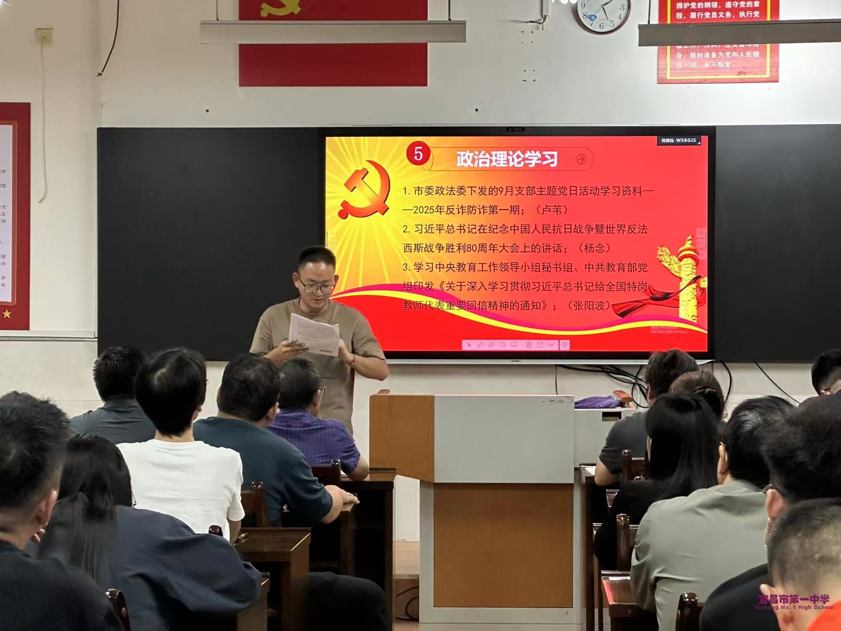 在政治理论学习中,卢苇同志带领大家共同学习市委政法委下发的九月支部主题党日活动学习资料:2025年反诈防诈第一期。杨念同志领学“习近平总书记在纪念中国人民抗日战争暨世界反法西斯战争胜利80周年大会上的讲话精神”,并强调要深刻领悟伟大抗战精神的内涵实质。张阳波同志领学中央教育工作领导小组秘书组、中共教育部党组印发的《关于深入学习贯彻习近平总书记给全国特岗教师代表重要回信精神的通知》。